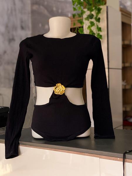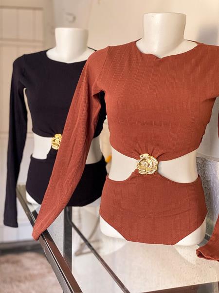 BODY COM ABERTURA NA CINTURA, FIVELA DE FLOR, TAMANHO ÚNICO, DISPONÍVEL EM DUAS CORES: MARROM E PRETO.