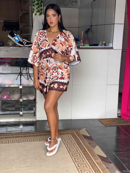 Esse macaquinho floral é perfeito para os dias mais quentes, com modelagem leve e estampa delicada que valoriza qualquer look. Possui elástico na cintura, garantindo ajuste confortável e valorizando a silhueta. Ideal para composições casuais, passeios ou viagens.