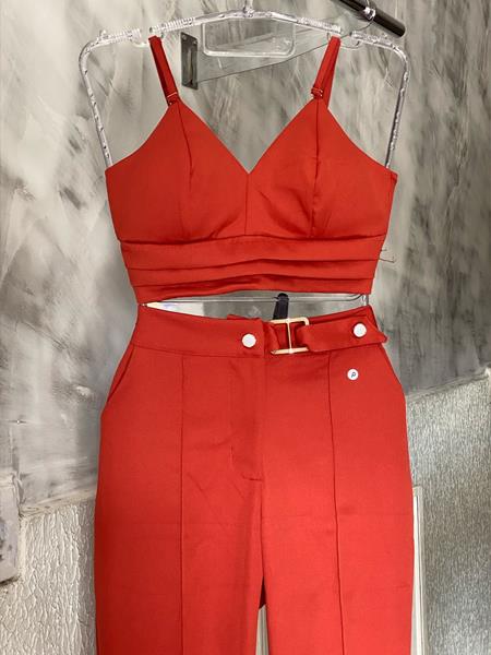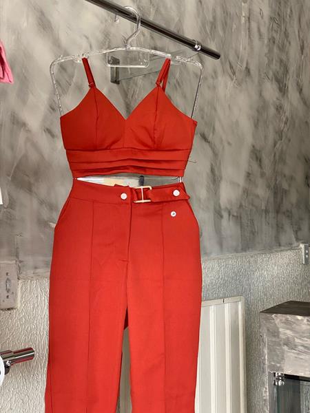 Conjunto de alfaiataria terracota com cinto em fivela dourado, tamanho P, vestindo até 40.