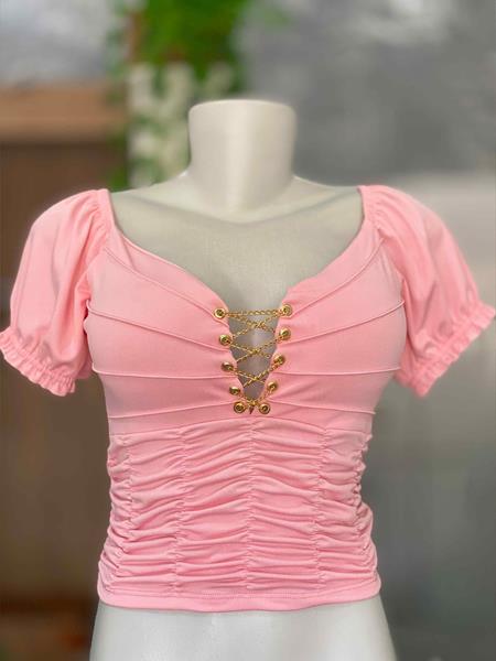 Cropped com detalhes de correntes no peitoral, detalhado na região da cintura e com elástico na manga e ombro.